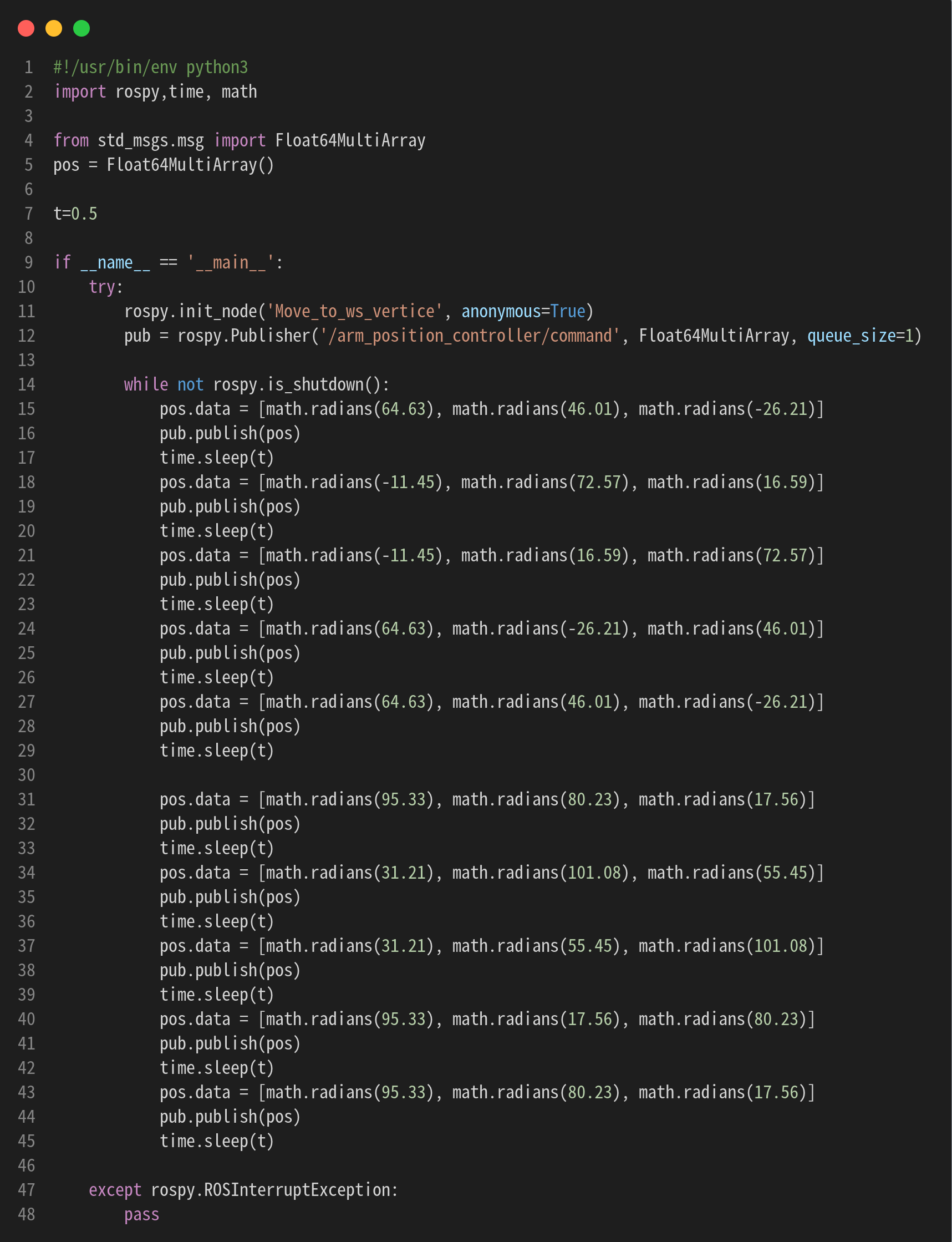 현재 PositionController를 사용하고 있기에 FloatMultiArray로 들어간 3개의 값은 각각 motor_1, motor_2, motor_3의 position input(각도, [rad])이 될 것이다.