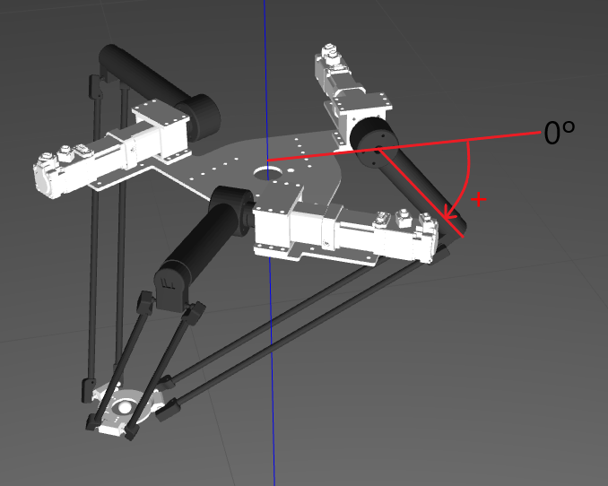 ●참고로 위 사이트의 각도를 읽을 때 좌표계와 각도 기준을 잘 봐서 코드에 넣어야 한다. 내가 만든 델타 로봇의 좌표계와 각도 기준 설정은 아래 그림과 같다.