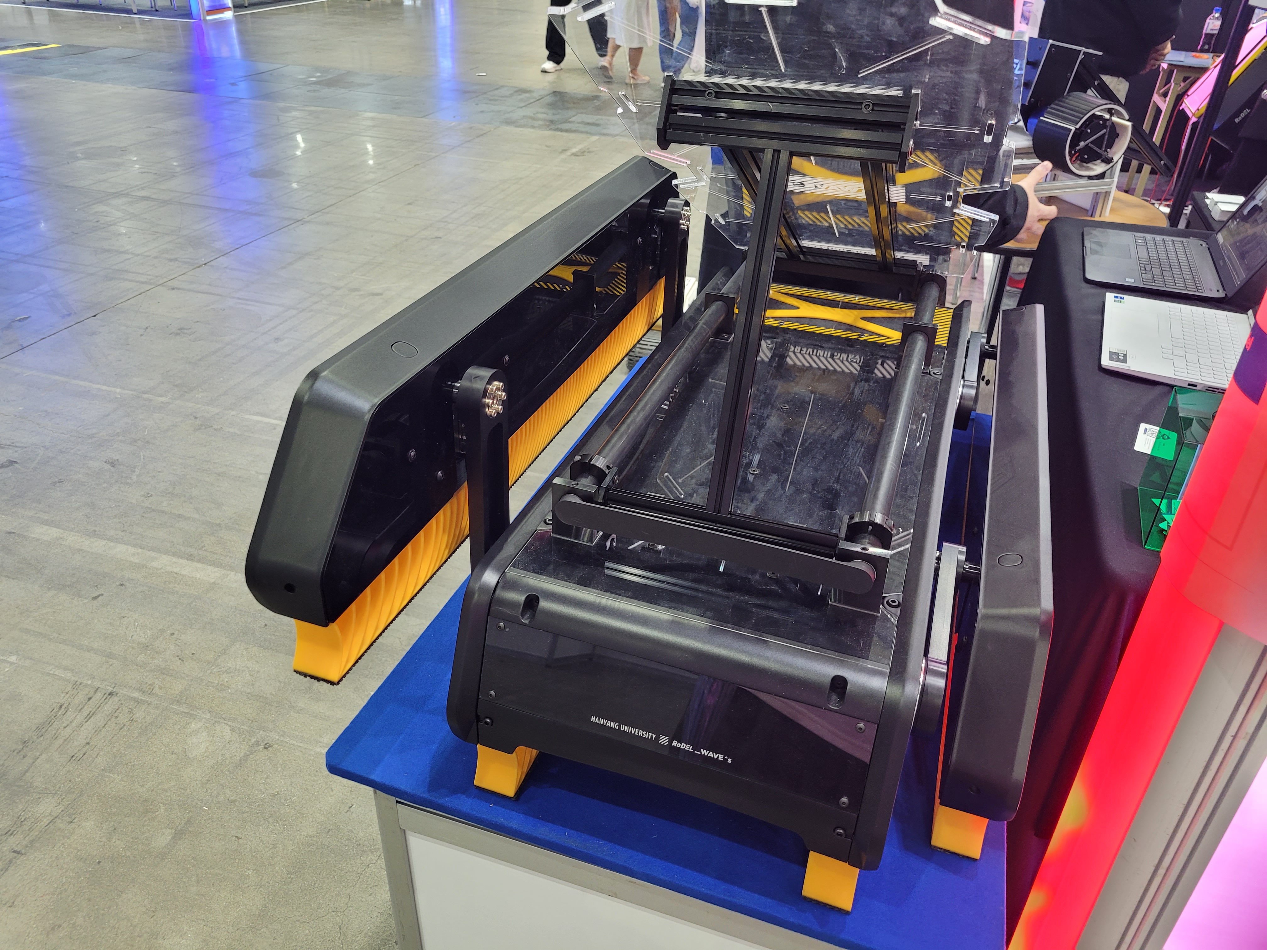 현장에는 WAVES를 들고 오셨는데 WAVE의 후속 모델로 기존의 WAVE가 링크에 파여있는 홈 부분이 계단 모서리에 걸려서 로봇을 들 수 있는 방식이었다면 WAVES는 해당 부분에 홈 대신 탄성 재질의 면을 부착해서 모서리와 닿는 부분이 살짝 들어가 고정되고 또 마찰력도 발생시키는 방식이었다.