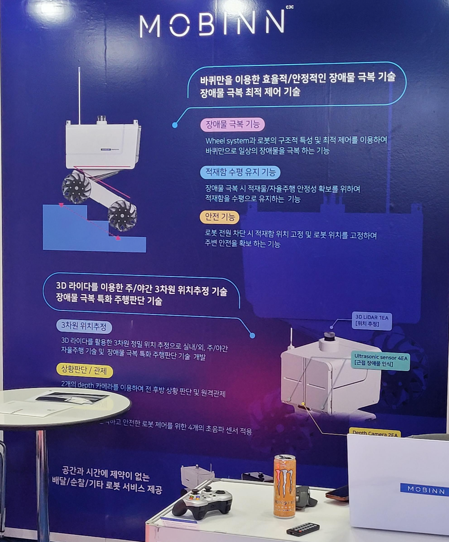 MOBINN이라는 자율주행배달 로봇으로 라이다(LiDAR), 초음파 센서, depth카메라 등을 이용하여 자율주행을 한다. 하지만 내가 관심 있던 것은 앞선 KIMM의 것과 마찬가지로 바퀴였다.