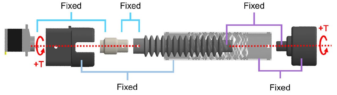 좌측의 서보모터를 base로 보면, 고무 벨로우즈의 좌측 끝은 base에 고정되어 있고 우측 끝은 HSA의 우측 끝에 고정되어 있다. 여기서 HSA 좌측 끝에 연결된 서보모터가 회전하면 HSA 입장에선 우측은 고정, 좌측은 회전하기에 Torsion이 걸리게 된다.