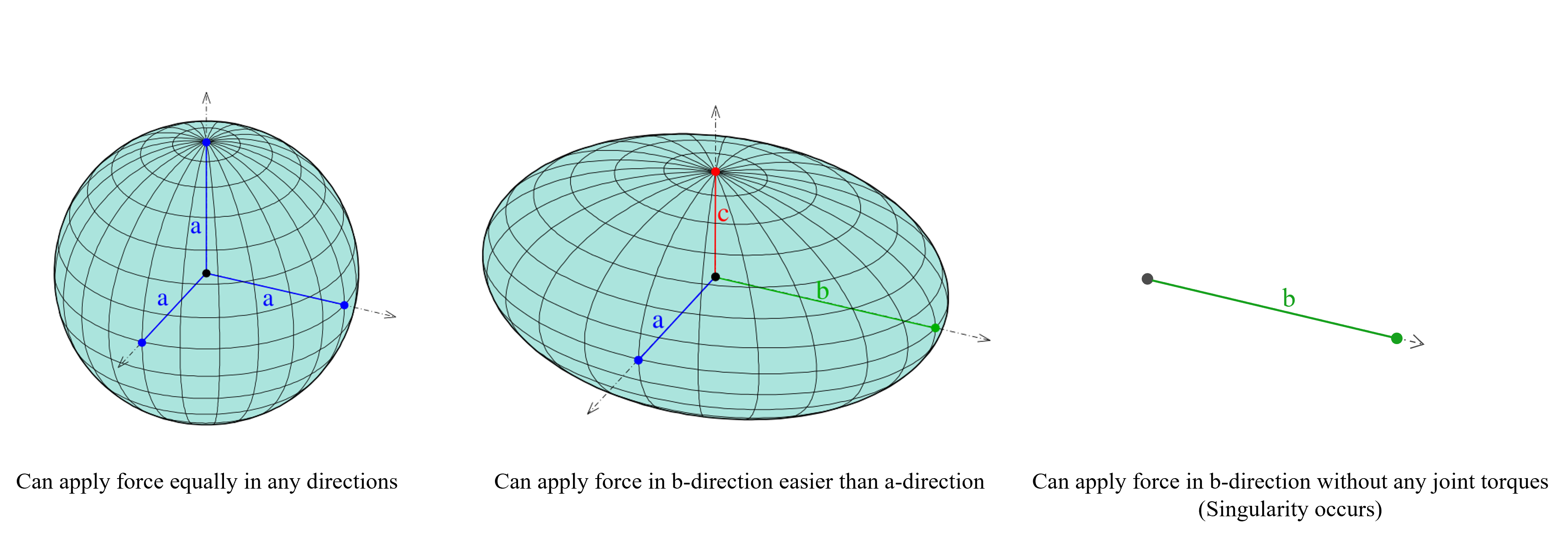 ●If the ellipsoid is close to a sphere(All principal lengths are similar), it indicates the end effector can move equally easily in any direction.