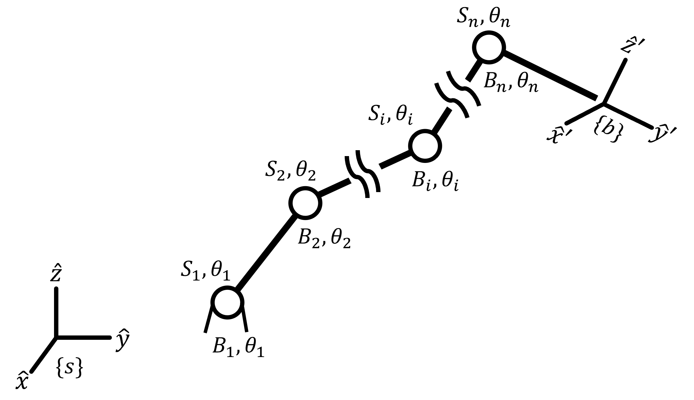 ② $\mathcal{B}_{1}...\mathcal{B}_{n}$ : Screw axes of each joints in {b} frame when the robot is at home position. (Using a symbol $\mathcal{B}$ instead of $\mathcal{S}$)