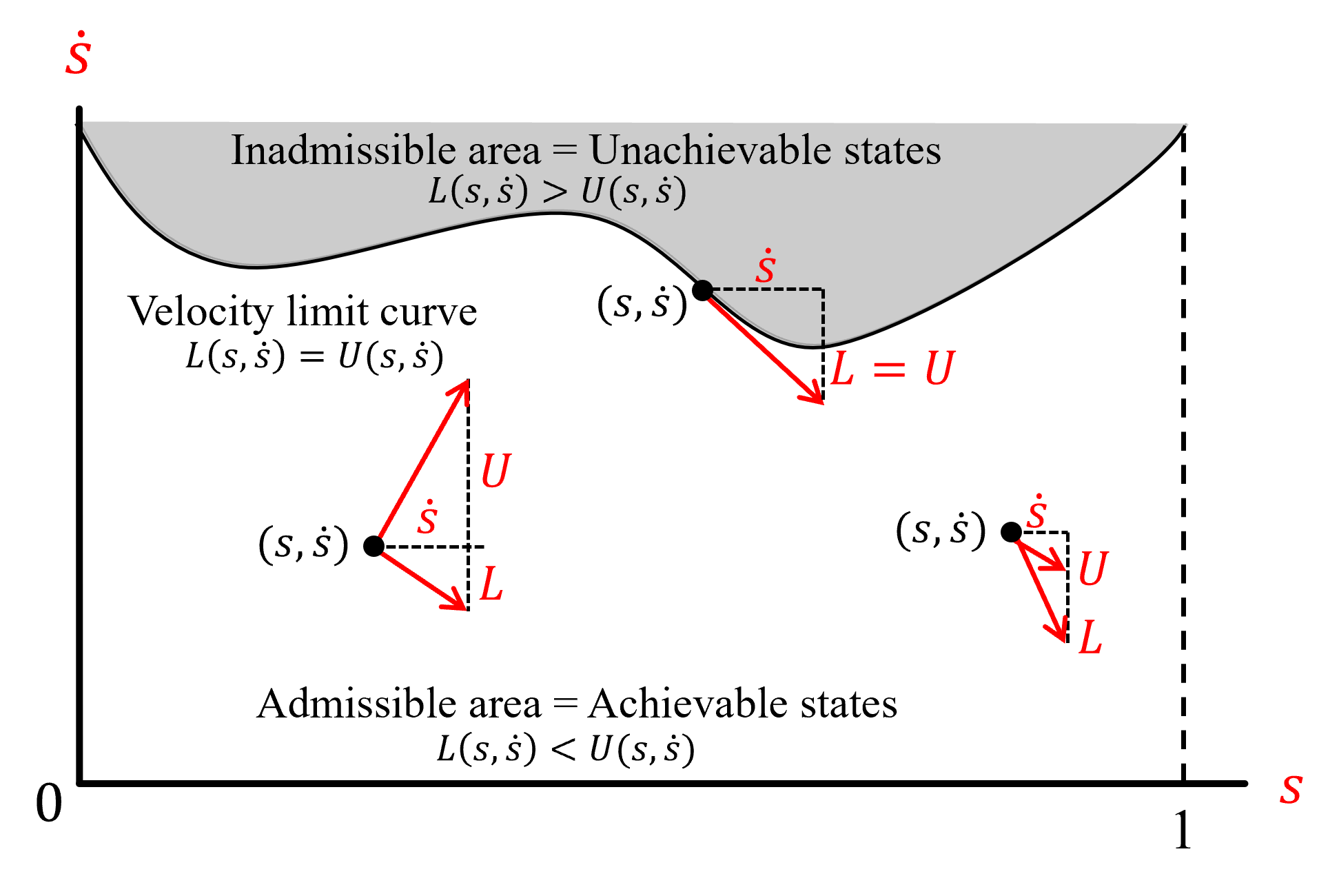 ●A state ($s,\dot{s}$) where $U(s,\dot{s})\lt L(s,\dot{s})$ is an unachievable state with the given torque limit and path.