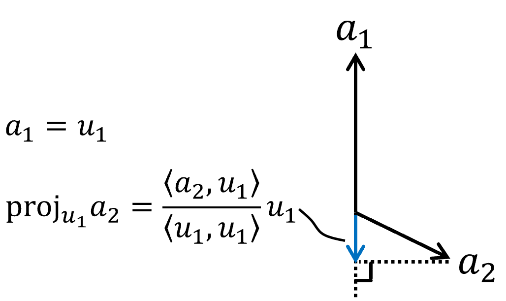 ④ 한편 $u_2=a_2-\text{proj}_{u_{1}}a_{2}$를 변형하면 $a_2=\text{proj}_{u_{1}}a_{2}+u_2=\frac{\left\langle a_2,u_1 \right\rangle}{\left\langle u_1,u_1 \right\rangle}u_1+u_2$를 알 수 있다.
