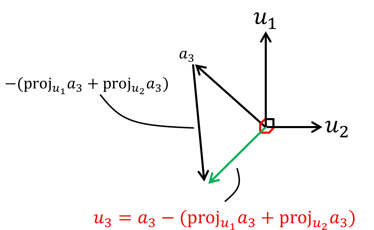 마찬가지로 $u_3=a_1-\text{proj}_{u_{1}}a_{3}-\text{proj}_{u_{2}}a_{3}$를 변형하여 얻은 식에서 $\color{Red}a_3$는 $\color{Red}u_1$, $\color{Red}u_2$, $\color{Red}u_3$의 linear combination으로 완전히 표현 가능함을 알 수 있다.