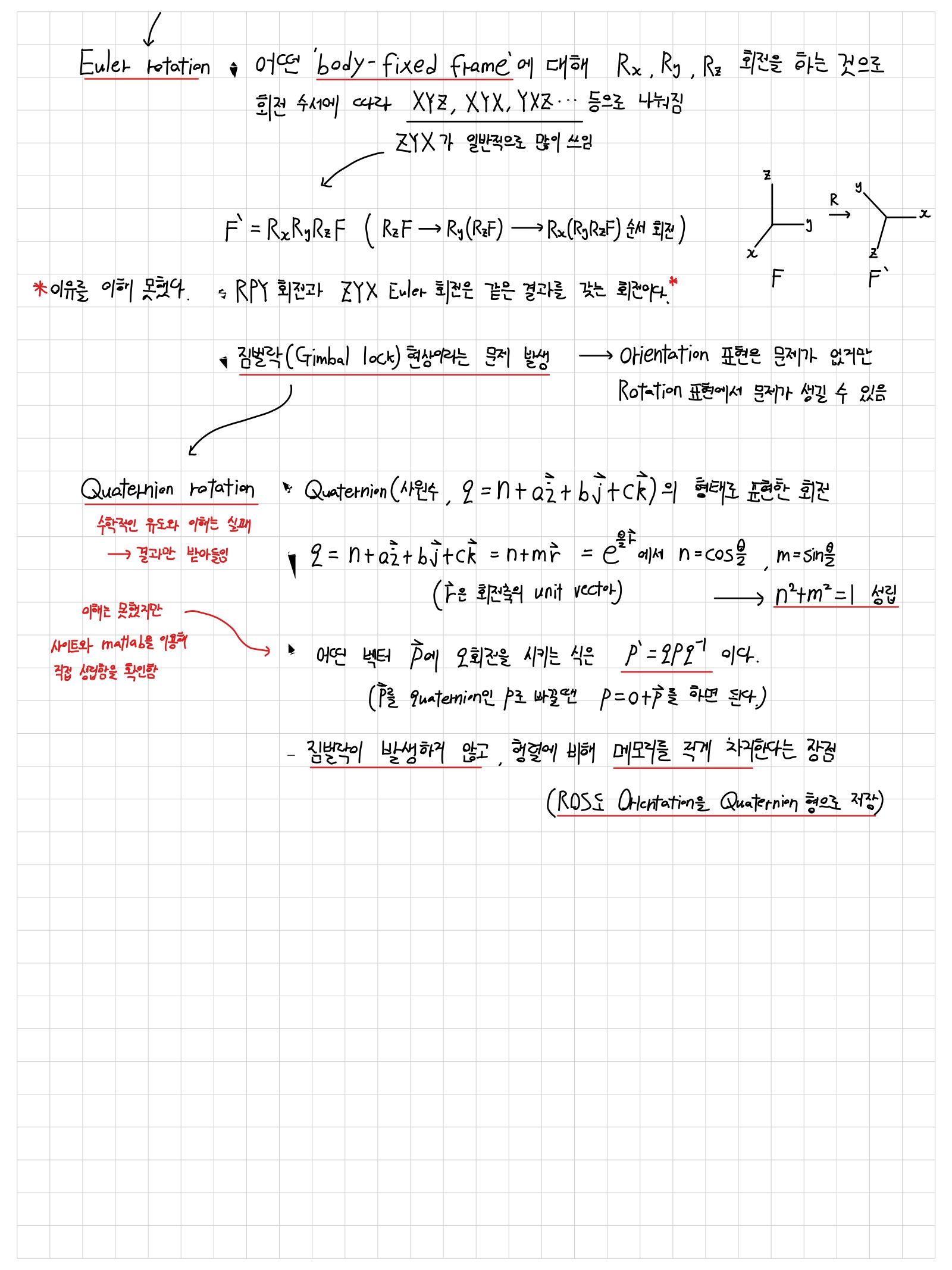 저번 시간에는 강체의 회전을 기술할 때 일반적으로 사용하는 오일러 각과, 오일러 각으로 물체의 orientation 방향의 변화(?)인 회전 모션을 표현할 때 일어날 수 있는 문제에 대해서 알아보았다. G