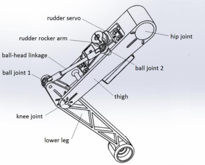 ●(사진 4.) 우선 이 논문은 joint2 설계에 'ball head linkage'를 사용했다. 물론 motor2이 ⓑ처럼 body에 올라가 있는 것은 아니지만 모터의 방향을 세로로 장착할 수 있어 'femur의 두께(가로길이)가 커지는 것'과 'link가 지나치게 femur 밖으로 나가는 것'을 막을 수 있었다고 생각한다(내 생각). 또한 기본적으로 4절 링크를 유지하기에 해석도 크게 어려워지지는 않았다.