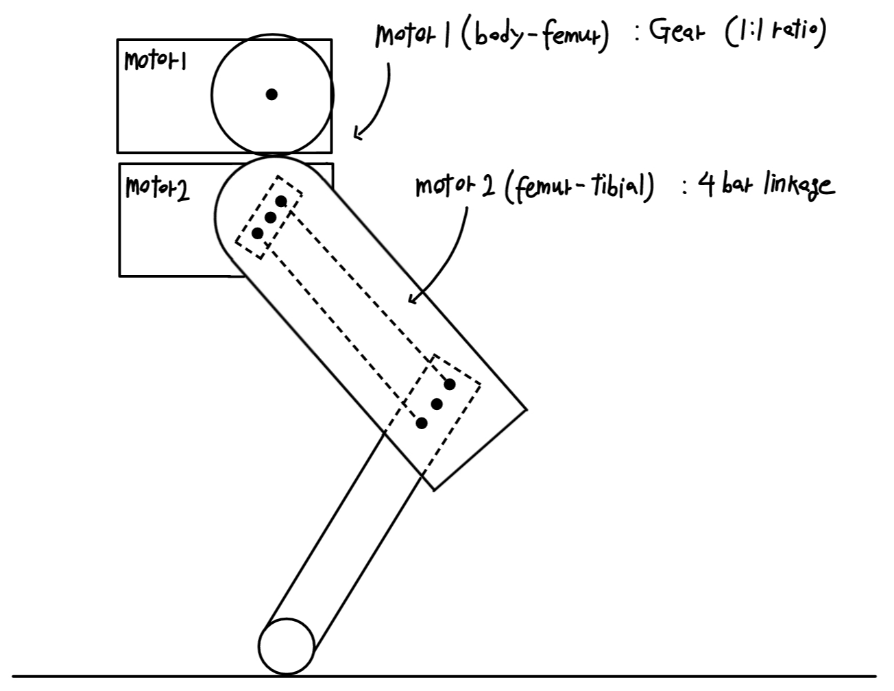 ●이 논문의 로봇도 motor2를 body에 올렸다. 이 로봇의 경우 joint2 구동을 위해 5절 링크를 사용했다.(*전체 다리를 기준으로 보면 6절 링크이다.)